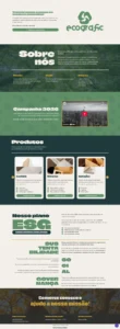 As seções contam de forma fluida a missão da ecografic como empresa voltada à sustentablidade, com a página montada estratégicamente para garantir humanização e conforto visual, além de um dinamismo único para firmar seu grande diferencial de mercado, a ESG.
